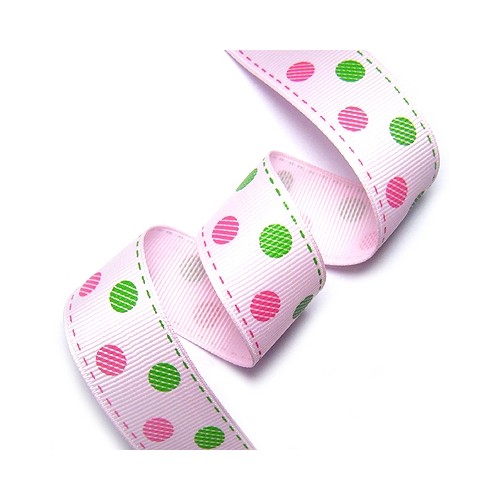 핑크색 바탕리본에 투톤컬러 땡땡이 스티치 프린트 리본입니다.