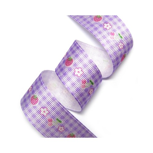 체크바탕 딸기와 앵두, 꽃 프린트된 전사 리본입니다.