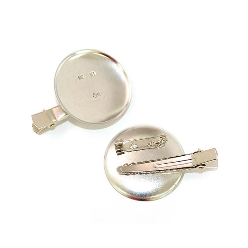 38mm사이즈의 오목한 원형 코사지핀대에 45mm사이즈의 집게핀이 달려있습니다.